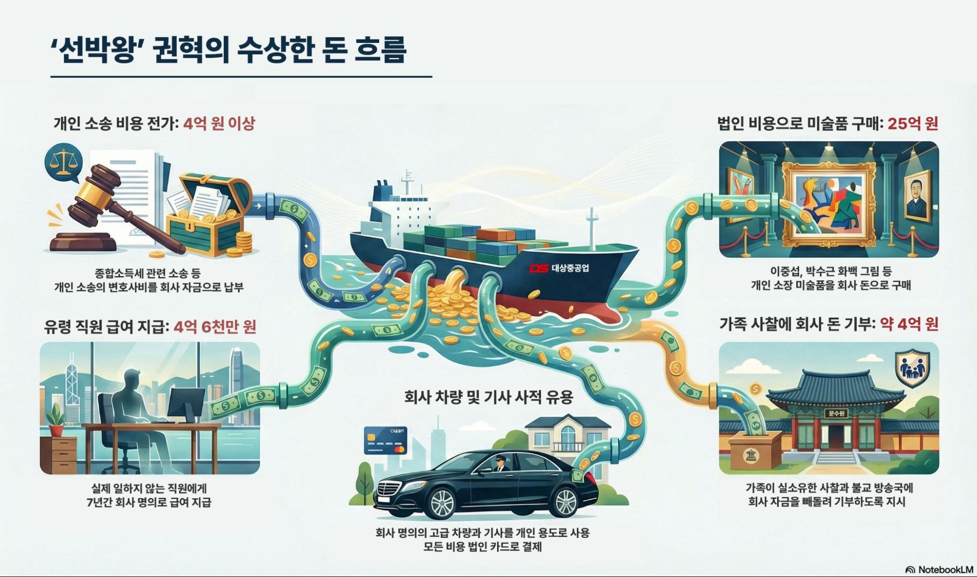 ▲ 권혁 회장은 자신이 실소유하고 있는 대상중공업의 돈을 횡령해서 변호사비, 미술품 구매 등에 쓴 의혹을 받고 있습니다. (Google NotebookLM으로 생성한 이미지) |