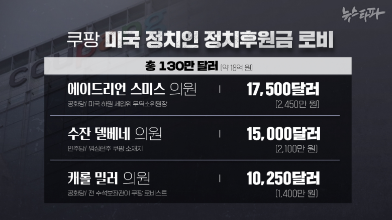 - 이렇게 쿠팡이 지출한 로비자금에는 한화 18억 원에 달하는 정치후원금도 포함돼 있었습니다. 미 하원에서 쿠팡을 옹호하고 나섰던 의원들(에이드리언 스미스, 수잔 델베네, 캐롤 밀러) 역시 쿠팡으로부터 한화 1,400만 원에서 2,400만 원에 달하는 정치후원금을 받은 것으로 밝혀졌어요.🤔