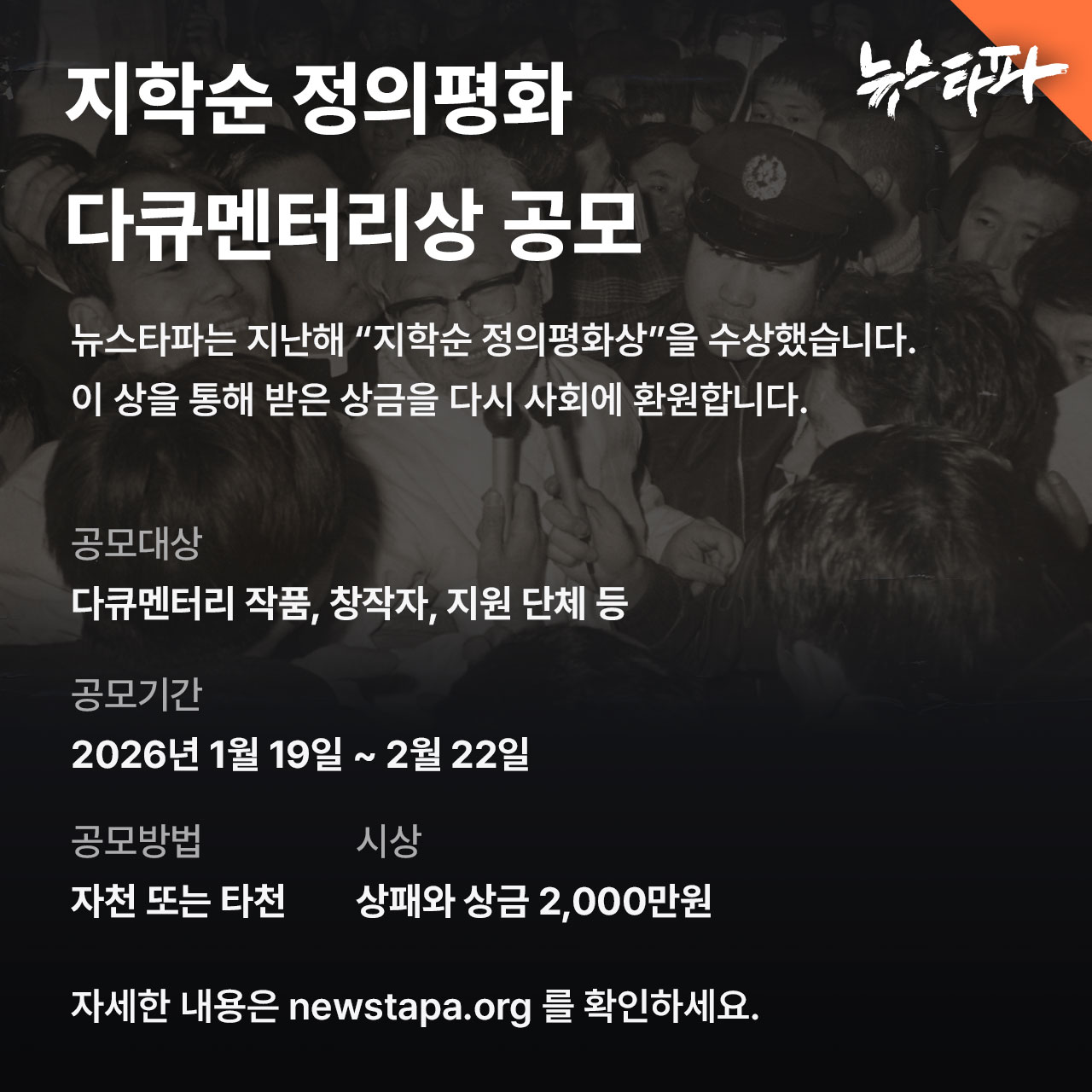 뉴스타파와 저스피스는 드러나지 않는 곳에서 본연의 역할을 수행하고 있는 다큐멘터리 창작자, 단체, 작품을 찾아 지원하고자 합니다. 제1회 지학순 정의평화 다큐멘터리상에 많은 지원과 관심 바랍니다.