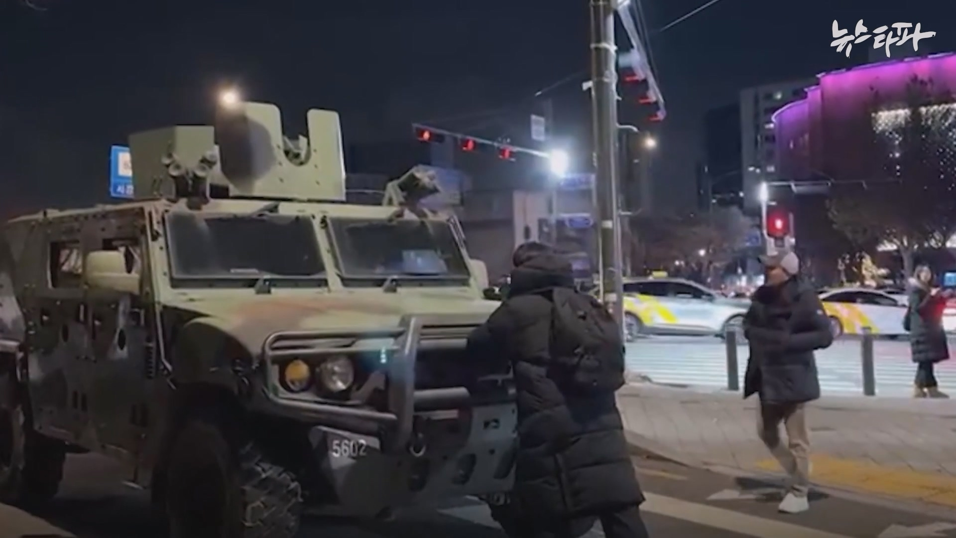 ▲ 12·3 내란 당시 군용 차량을 시민이 몸으로 막고 있는 모습. |
